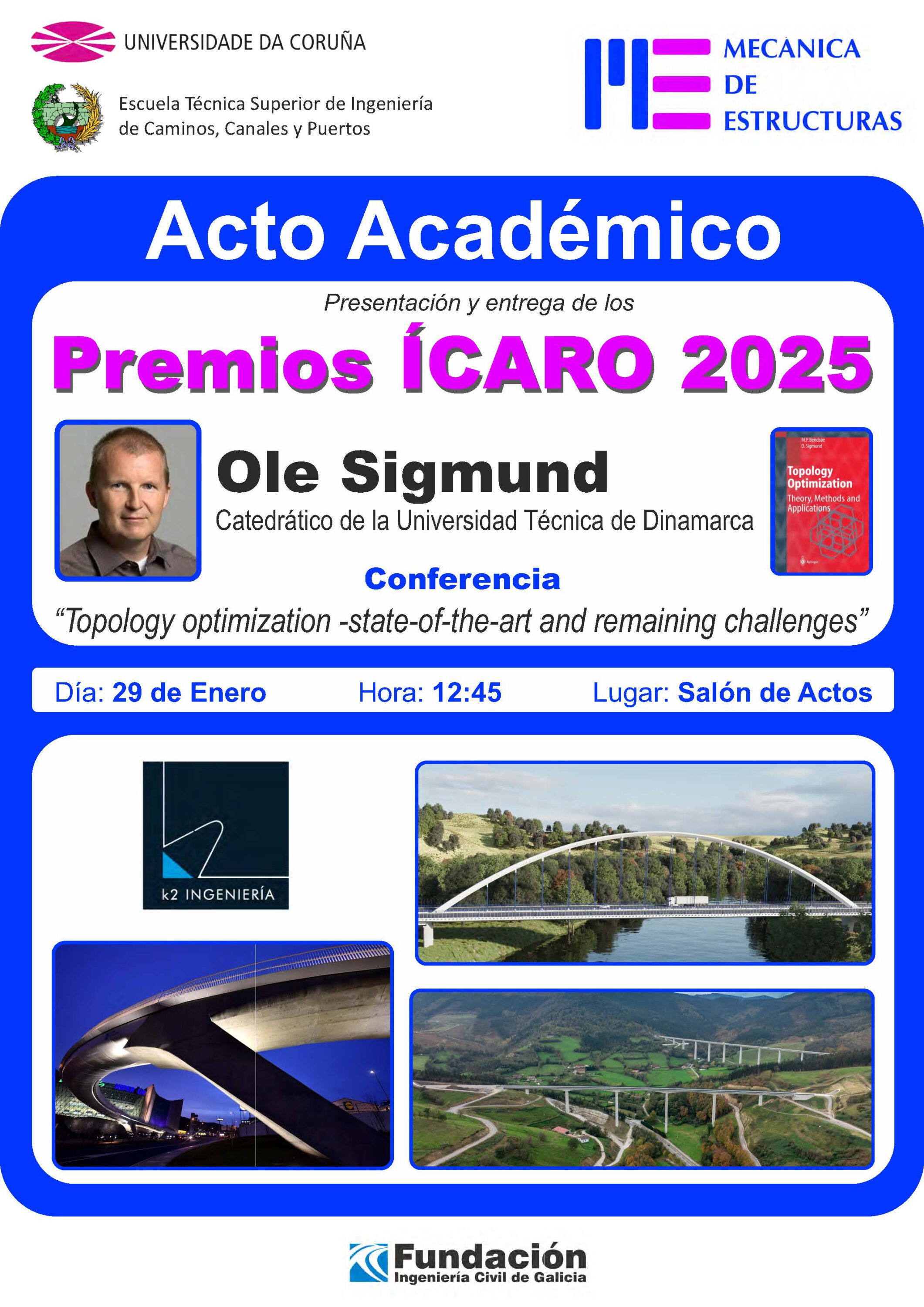Los Premios ÍCARO se conceden de manera ininterrumpida desde el año 2006 por el Grupo de Mecánica de Estructuras de la UDC como una actividad vinculada a su intensa trayectoria académica internacional de docencia investigación y transferencia. Los galardones consisten en un diploma acreditativo y en una escultura de la artista Pilar Pérez Subías. Se establecen dos modalidades, una primera que premia la aquellas instituciones o entidades que hayan contribuido de forma eficaz y continuada al desarrollo de las actividades docentes, investigadoras e innovadoras del GME; y una segunda que reconoce al personal investigador o profesionales de la ingeniería reconocidos internacionalmente por su excelencia y por sus contribuciones relevantes en el ámbito de la ingeniería de estructuras. Un reconocimiento con una amplia trayectoria A lo largo de sus dos décadas de historia, los Premios ÍCARO distinguieron la numerosas instituciones, empresas, investigadores y proyectistas de referencia en el ámbito de la ingeniería civil y de estructuras. En la modalidad de instituciones y empresas, fueron reconocidas entidades como la Fundación de la Ingeniería Civil de Galicia, Acciona Infraestructuras, Ferrovial, SACYR Construcción, el Instituto Tecnológico de Galicia, AIRBUS o ARRAY Technologies, así como profesionales y responsables institucionales como Ethel Vázquez Mourelle, conselleira de Infraestructuras y Movilidad de la Xunta de Galicia.